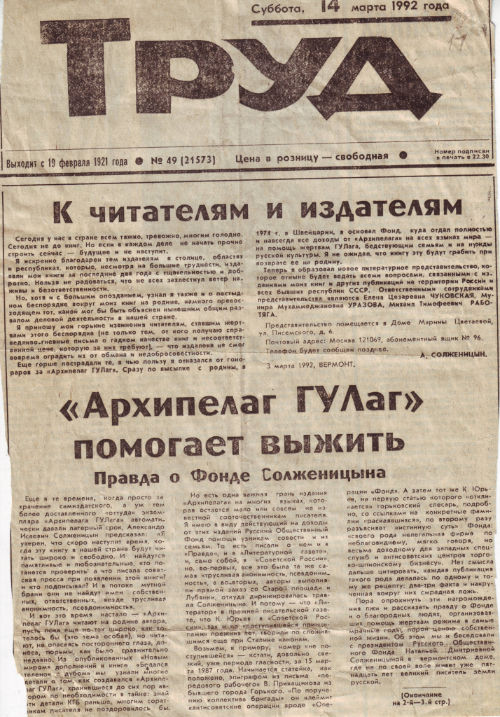 28 декабря 1973 — в Париже, в издательстве YMCA-PRESS, выходит первый том «Архипелага ГУЛАГ» на русском языке.